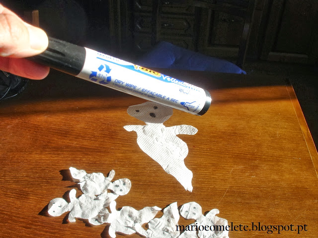 Depois de ter visto no blog da Marvan esta atividade muito simples, pensei logo que a tinha de fazer com o F. E assim foi. Ontem estivemos a fazer fantasmas de papel higiénico, para que ficarem muito finos e a ver se eles voavam.